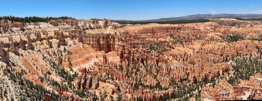 Nach etwa drei Stunden Fahrt mit mehreren „Scenic Views“ entlang der Strecke erreichen wir den Bryce Canyon Nationalpark. Unser Hotel, Ruby’s Inn, ist eine riesige Hotel- und Campinganlage direkt am Parkeingang, wo wir zwei Nächte verbringen. Und hier scheint es alles zu geben… SEHR viele Menschen, aber auch etliche Einkaufsmöglichkeiten, Unterhaltung etc. – Fast ein wenig reizüberflutend für uns.