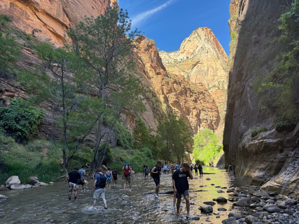 Im Park selbst setzt sich der Andrang leider fort. Menschenmassen auf den Wegen – unglaublich. Das haben wir so bisher zum Glück noch nicht erlebt. Fast alle wollen zu „The Narrows“, dem berühmten Wanderweg durch den Fluss. Wir nicht – nicht bei so vielen Menschen. Außerdem haben wir noch nicht ins Hotel eingecheckt und tragen all unsere Wertsachen bei uns. Die Vorstellung, mitsamt Rucksack im Wasser zu landen, schreckt uns dann doch etwas ab. 😂