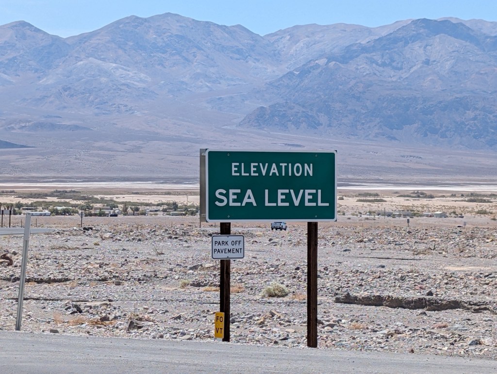 Ein einziger Tag im Death Valley – und wir sind sehr überwältigt – von der Hitze, der Landschaft und der Tatsache, dass wir uns auf Höhe des „Sealevels“ bzw. teilweise sogar 85,5 m darunter befinden.