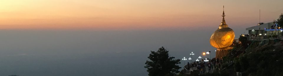 Und das ist der „Golden Rock“ – der goldene Felsen. Eines der wichtigsten buddhistischen Stätten in Myanmar. Frauen ist der Zutritt direkt zum goldenen Felsen verboten, Männer haben Zutritt und kleben Goldplättchen um Goldplättchen auf den Felsen. Niemand wird sich fragen, warum der Felsbrocken nicht runterfällt… Er wird von einem Haar Buddhas im Gleichgewicht gehalten!