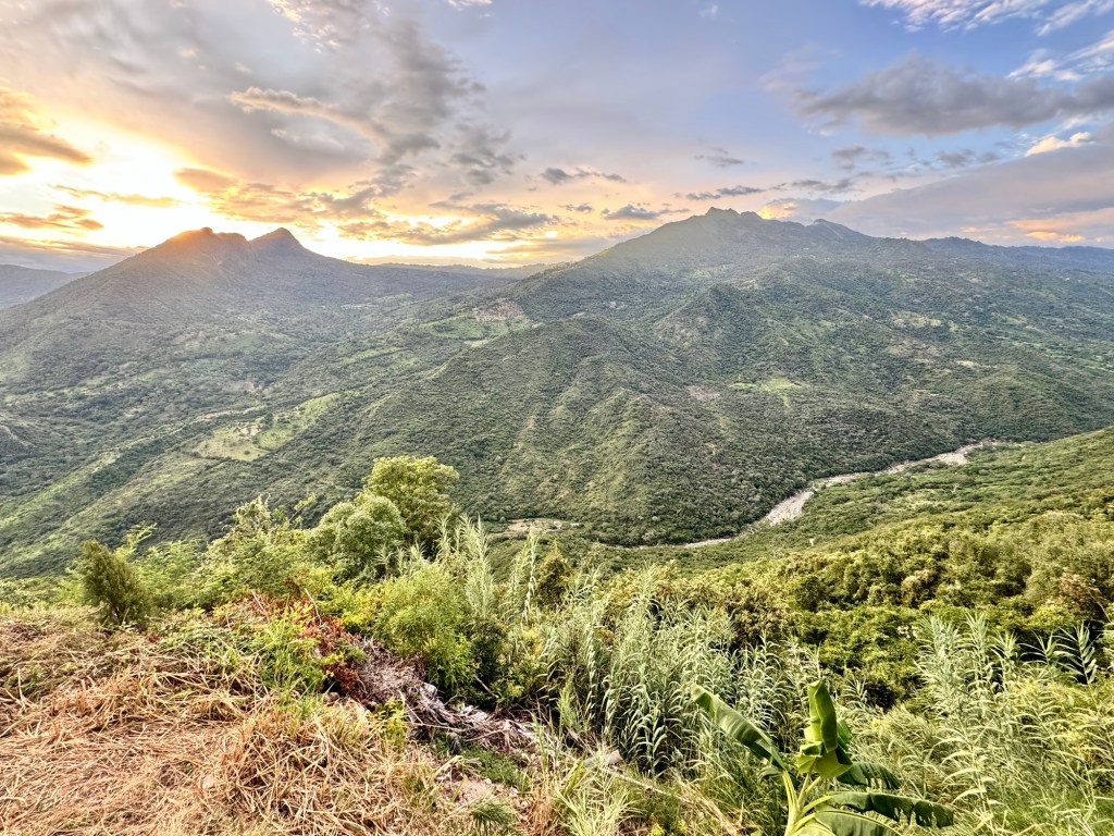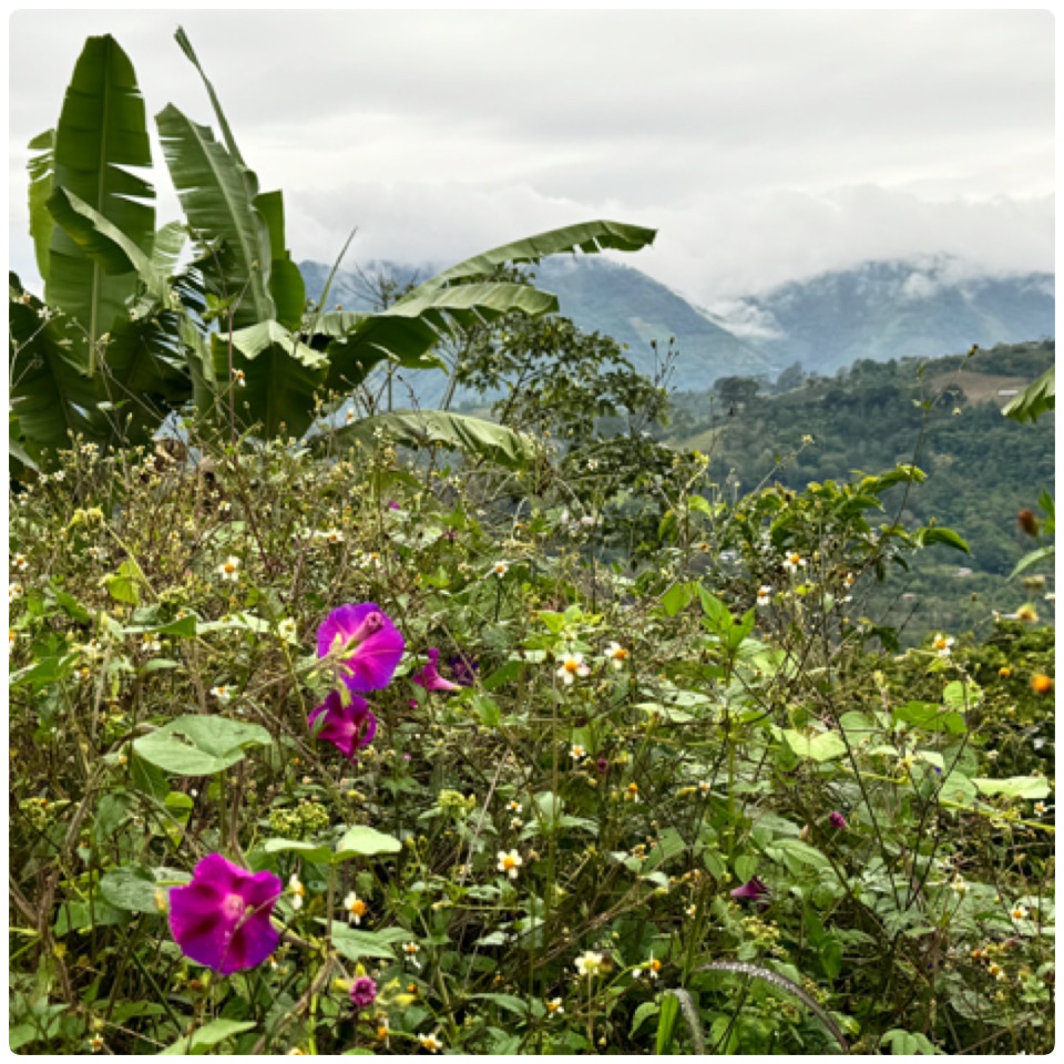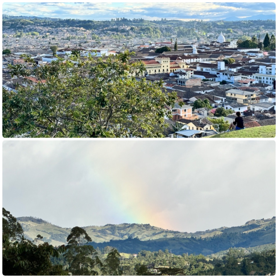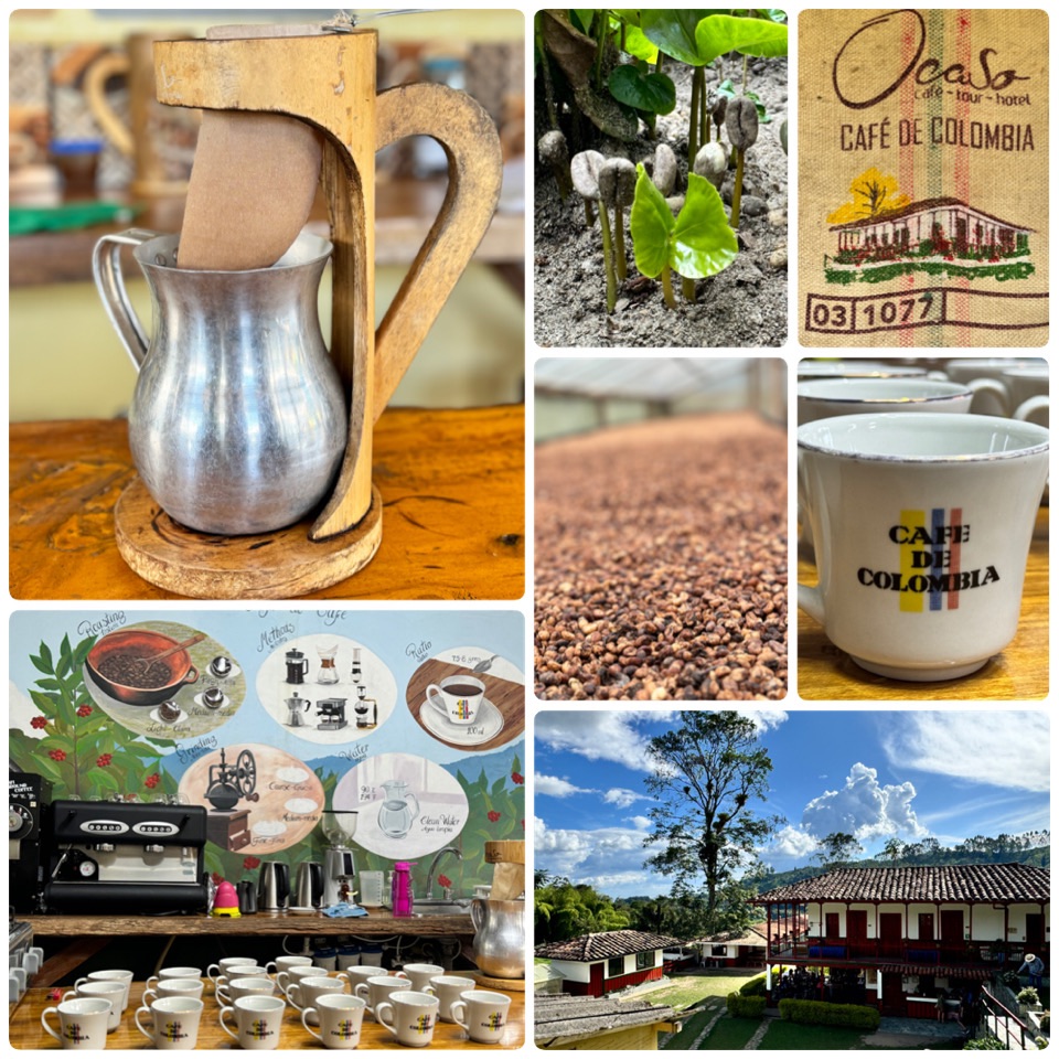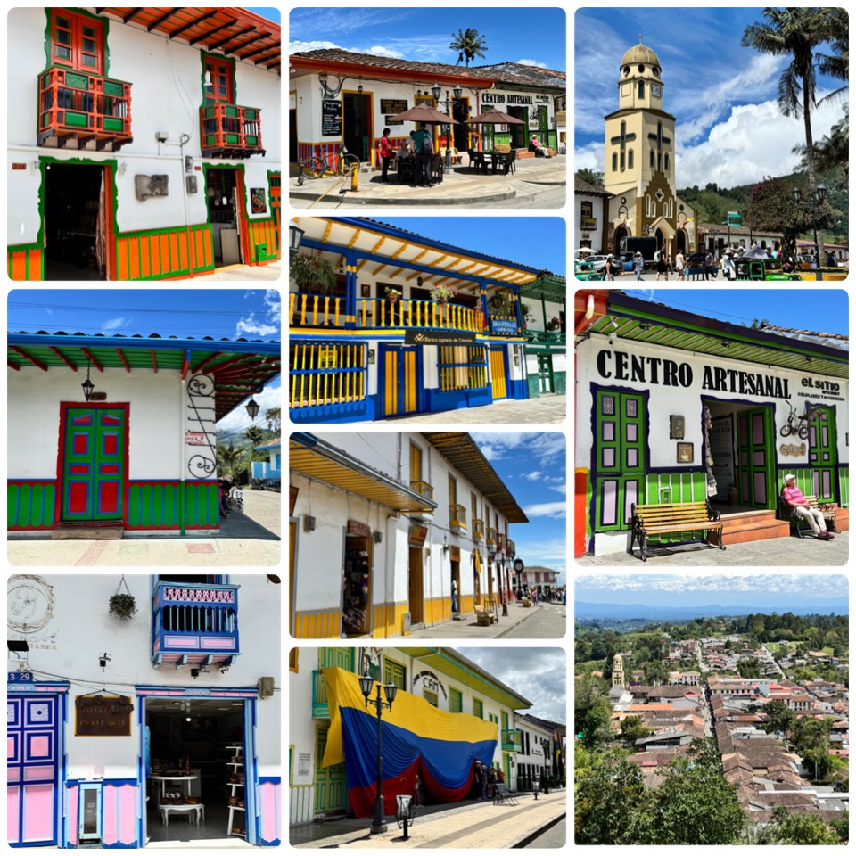Und nun sitzen wir zufrieden im Bus und fahren – kolumbianische Musik hörend – „in die Zona Cafetera, die Kaffeezone, eine der reizvollsten Regionen des Landes. Auf dem Weg dorthin durchqueren wir atemberaubende Berglandschaften und riesige sattgrüne Kaffeefelder, die sich im Schatten von Nussbäumen und Bananenstauden wie überdimensionale Teppiche über die steilen Hänge ziehen. In der Ferne schimmern die schneebedeckten Gipfel der Vulkane des Los Nevados Nationalparks. Dazwischen liegen pittoreske Dörfer, Plantagen mit Orangen, Lulo, Kakao, Papaya, bunte Blumen und Bäume.“