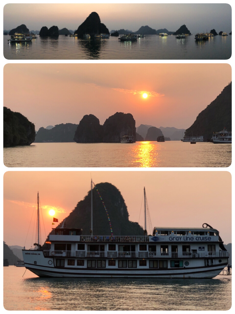 Zurück auf dem großen Schiff hat man nun die Gelegenheit, an einem kleinen „Kochkurs“ teilzunehmen, bevor es dann das eigentliche Abendessen gibt. Der „Kurs“ wird aber auch noch am nächsten Abend angeboten, so dass wir heute darauf verzichten und es einfach genießen, in der Ha Long Bucht zu sein – mit einem traumhaften Sonnenuntergang…